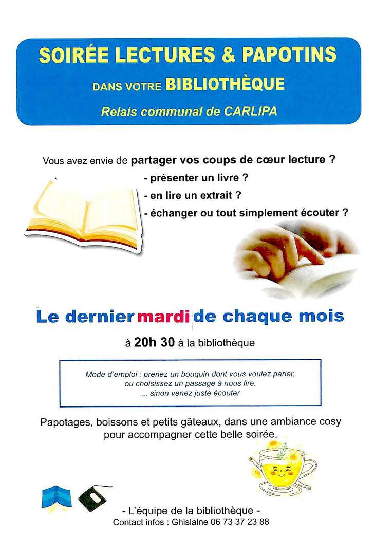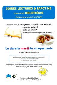 L'équipe de la bibliothèque vous attend le dernier mardi de chaque mois pour une soirée "LECTURES ET PAPOTINS".