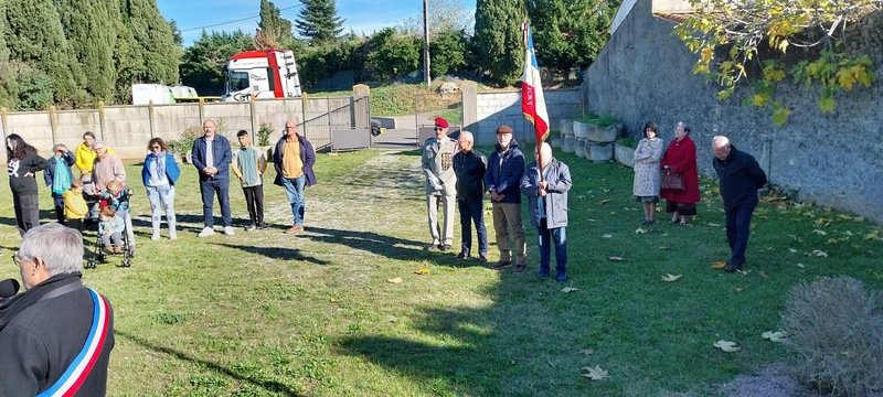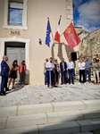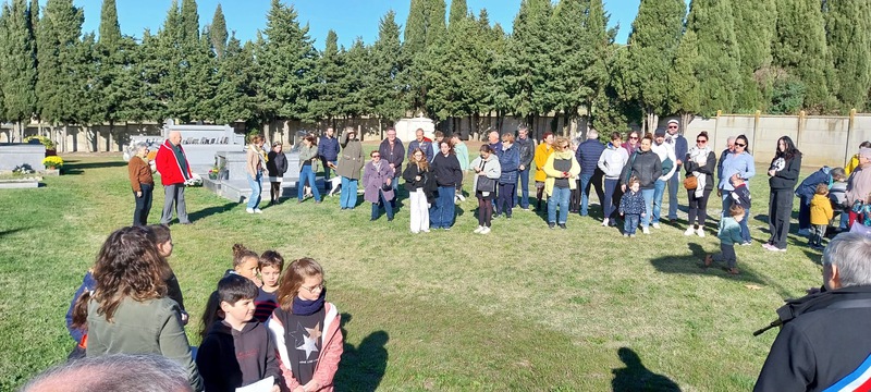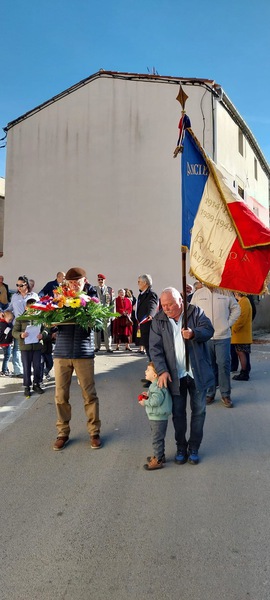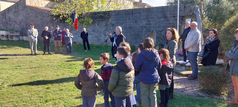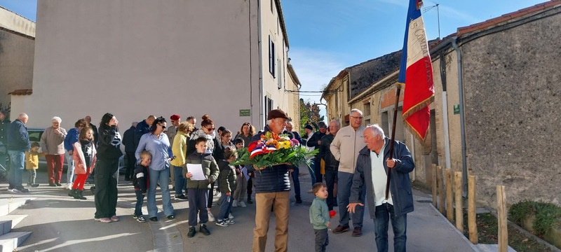 Au pied du monument aux morts, lecture du message du Président de la République par les élèves de l'école du village, dépôt de gerbe et rameaux d'olivier, appel aux morts, minute de silence et hymne