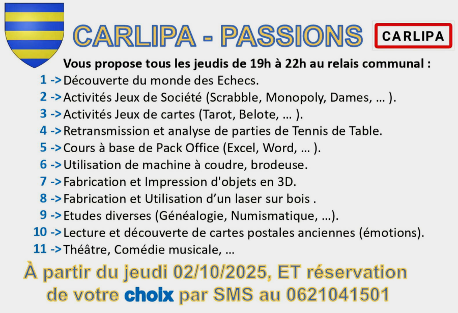 Prochain rendez-vous le mardi 28 octobre à 20 heures 30 au Relais Communal.