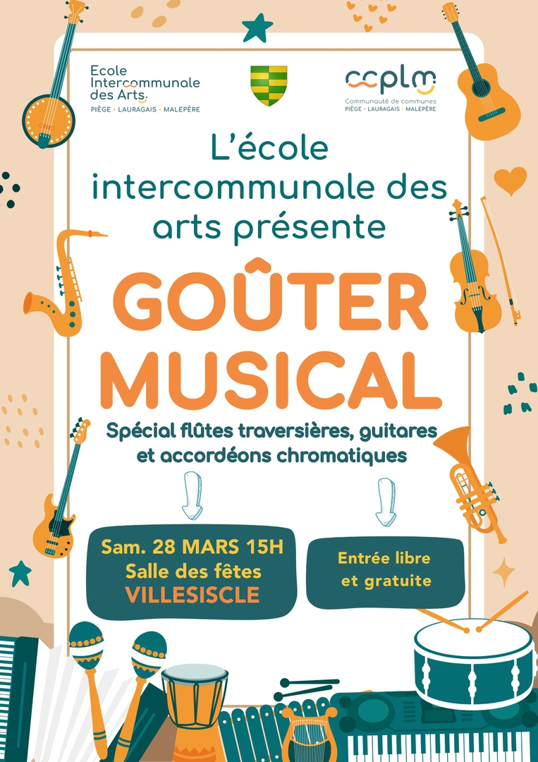 L’École Intercommunale des Arts vous invite à un goûter musical le samedi 28 mars à 15h, à la salle des fêtes de Villesiscle.